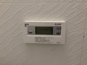 施工後の写真1枚目では、裏口付近に設置されたMITSUBISHI製エコキュート本体をご確認いただけます。省エネ性能が向上し、福山市の一般的なご家庭でも電気使用量を抑えやすい仕様となっています。写真2枚目では、浴室内のリモコンが新品のMITSUBISHI製に交換され、視認性と操作性が大きく改善されました。