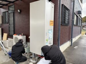 お客様宅では、設置から10年以上が経過した給湯器をご使用されており、最近になって湯温のばらつきやリモコン操作の反応低下が気になり始めたとのことでした。福山市は瀬戸内海沿岸の影響で湿度が高い時期も多く、給湯機器や電気工事設備が経年劣化しやすい環境です。こうした条件下では、エコキュート内部の電子部品や配線に少しずつ負荷がかかり、突然の故障につながるケースも珍しくありません。