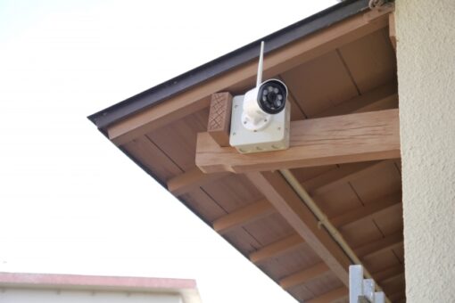 後日、玄関と駐車場の見通しを確認し、それぞれにカメラを設置。